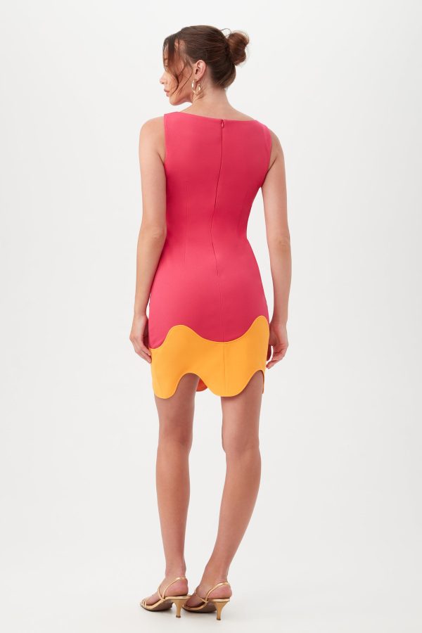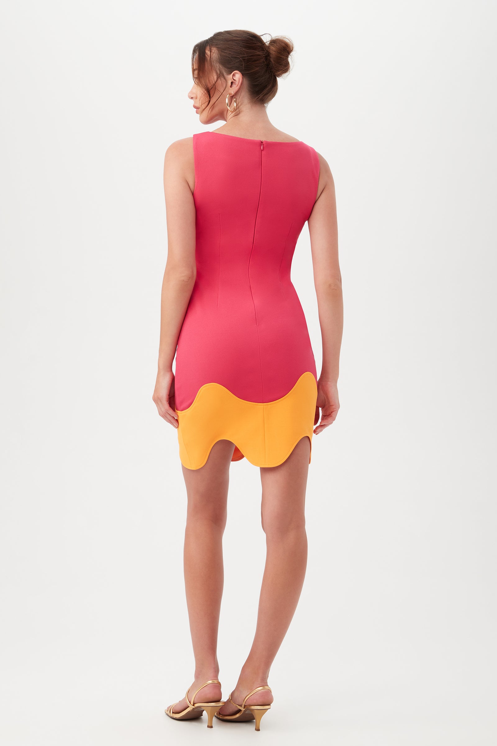 This color-blocked sleeveless dress boasts a boatneck and sleeveless design. with a back zipper for easy wear. The wavy color-blocked hem and sheath silhouette create a sophisticated look. perfect for any event.